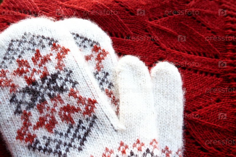Пушистые белые вязаные варежки из мохера с традиционным цветочным узором на спине. Пара модных аксессуаров варежек. Связана красными и черными нитками геометрическим жаккардовым узором. Зимняя одежда