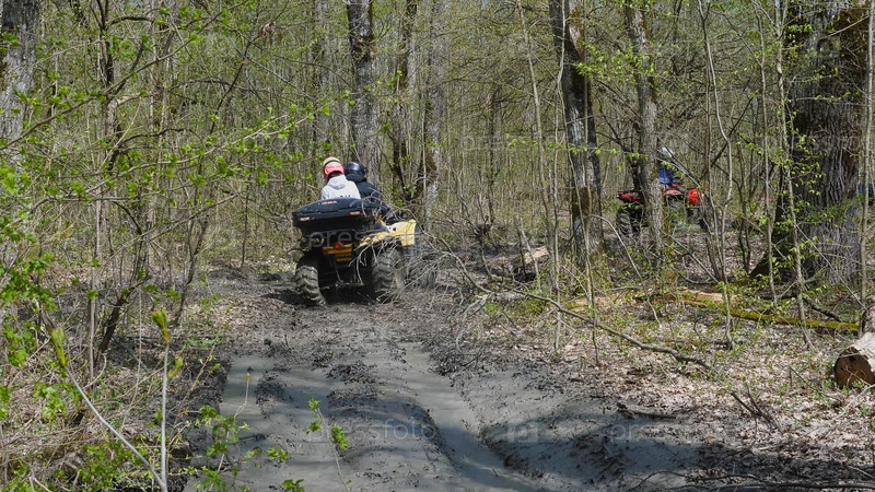 Пара на желтом квадроцикле едет по грязи и лужам в лесу. Вид сзади. Экстремальный вид активного отдыха. Катание на квадроцикле