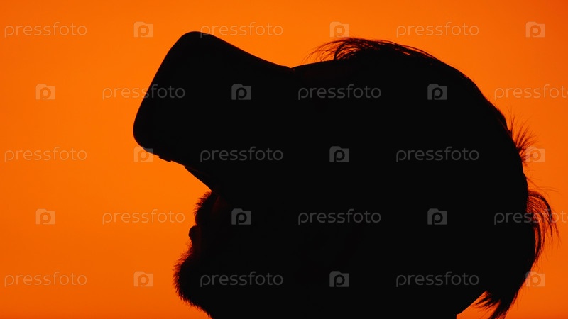 Крупный план головы бородатого и пушистого мужчины в очках виртуальной реальности на меняющемся фоне. VR-шлем для развлечений, обучения и игр