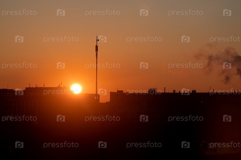 Оранжевый закат над крышами многоэтажных зданий на горизонте, городской фон