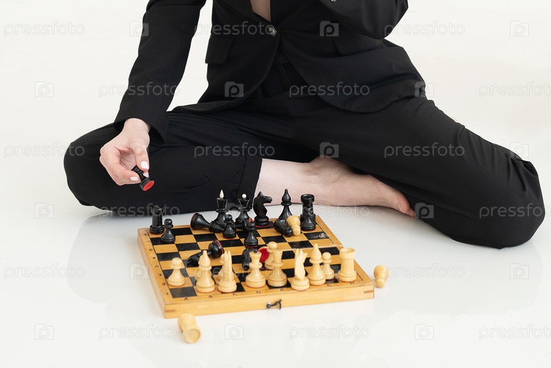 Женщина думает о следующем ходе, сидя перед шахматной доской с фигурами и держа в руке черную пешку