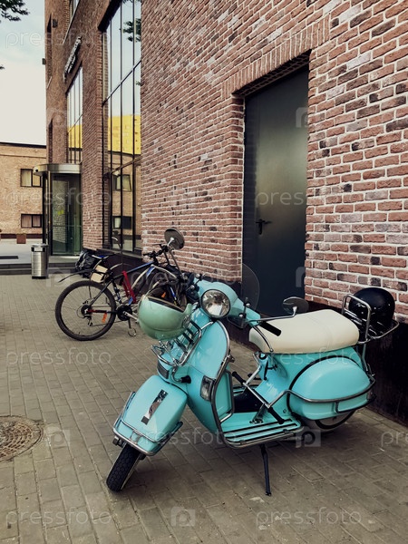 Синий ретро-скутер со шлемом, висящим на руле, припаркован на улице