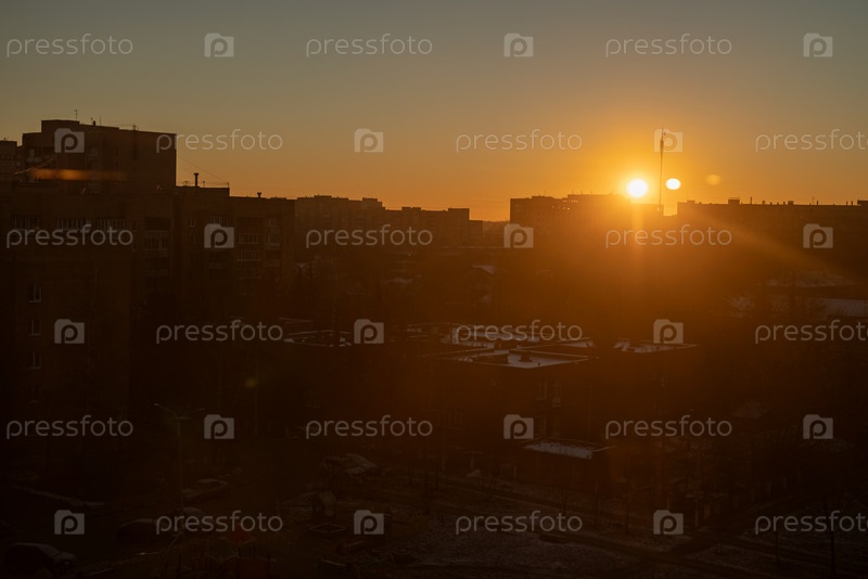 Рассвет над городом. силуэты домов в утренней дымке