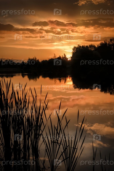 Летний красочный закат на озере с облаками, отраженными в силуэтах воды и травы на переднем плане