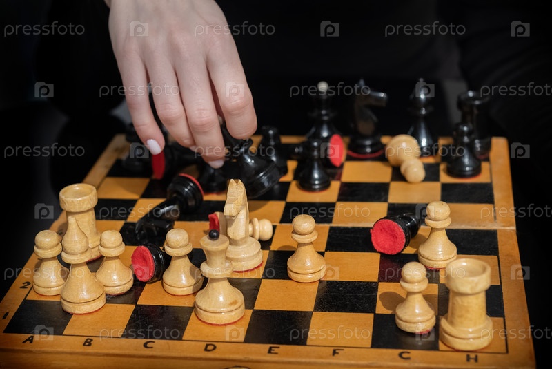 Женская рука двигает шахматную фигуру на старой деревянной шахматной доске