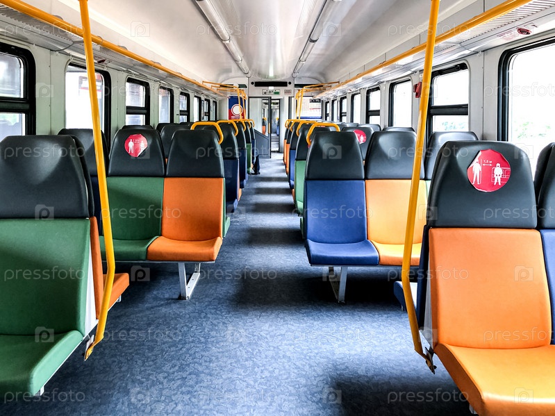 Пустые места в поезде с новыми знаками социального дистанцирования защищают во время пандемии коронавируса