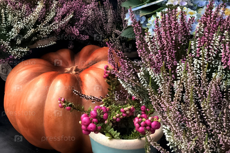 Собранная большая оранжевая тыква лежит среди розовых цветочных горшков вереска