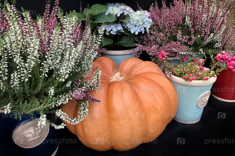 Собранная большая оранжевая тыква лежит среди розовых цветочных горшков вереска