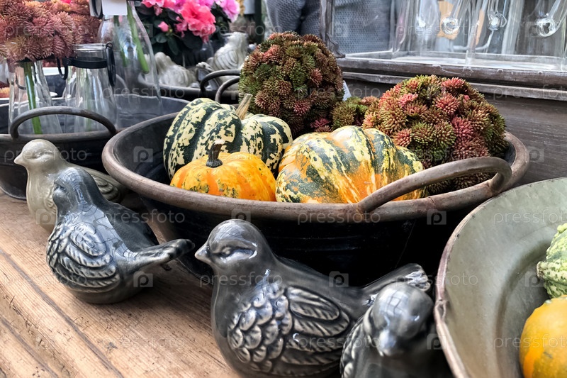 Декоративная керамика, винтажные коробки и маленькие тыквы на прилавке на осенней ярмарке