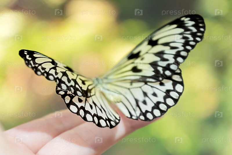 Нежная бабочка сидит на руке человека крупным планом, размытый фон