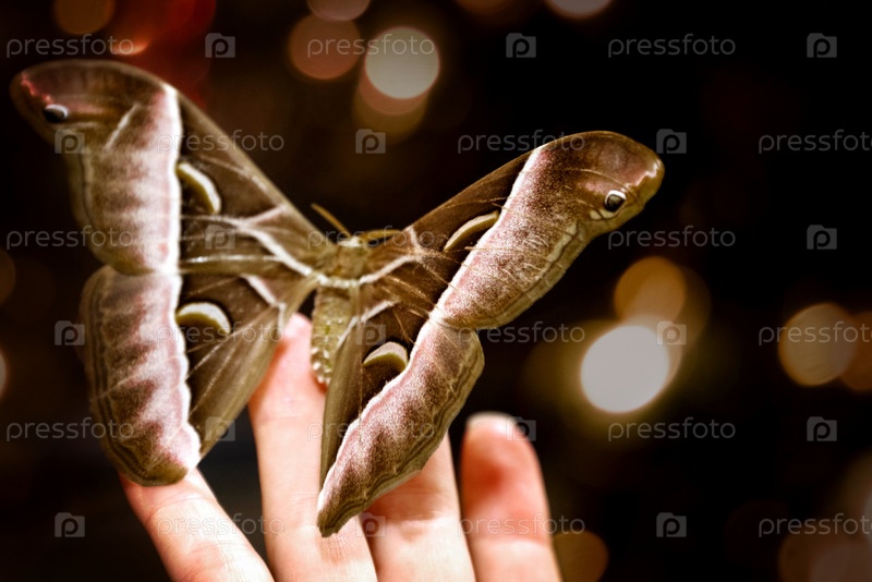 Большая бабочка Attacus atlas сидит на руке человека на размытом темном фоне