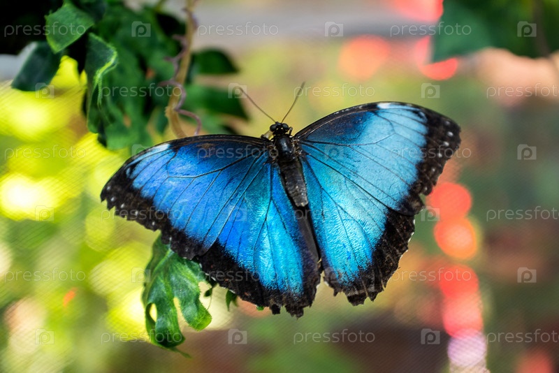Голубая бабочка-морфо с расправленными крыльями крупным планом на размытом фоне