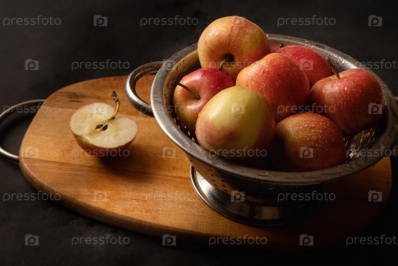 Металлическая миска, полная красных спелых яблок на деревянной разделочной доске Натюрморт. Ингредиенты для яблочного пирога. Готовим дома