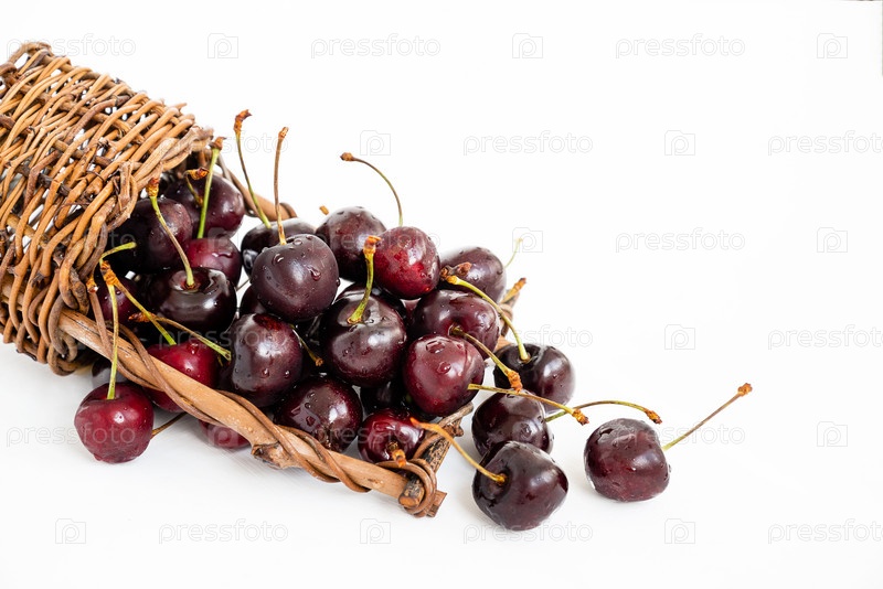Перевернутая плетеная корзина со спелой черешней, выпадающей из нее на белом фоне