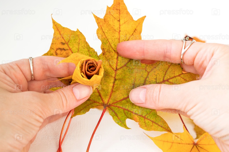 Третий кленовый лист скрученный поверх второго слоя листа. Как сделать осенний букет роз из разноцветных кленовых листьев. Концепция «сделай сам». Шаг 7 из 12 пошаговая фото инструкция