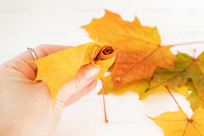 Второй кленовый лист скрученный поверх слоя первого листа. Как сделать осенний букет роз из разноцветных кленовых листьев. Концепция «сделай сам». Шаг 6 из 12 пошаговая фото инструкция