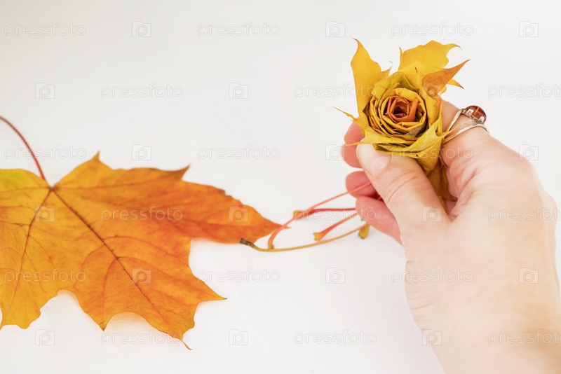 Листья клена накручены друг на друга, образуя цветок розы. Как сделать осенний букет роз из разноцветных кленовых листьев. Концепция «сделай сам». Шаг 8 из 12 пошаговая фото инструкция