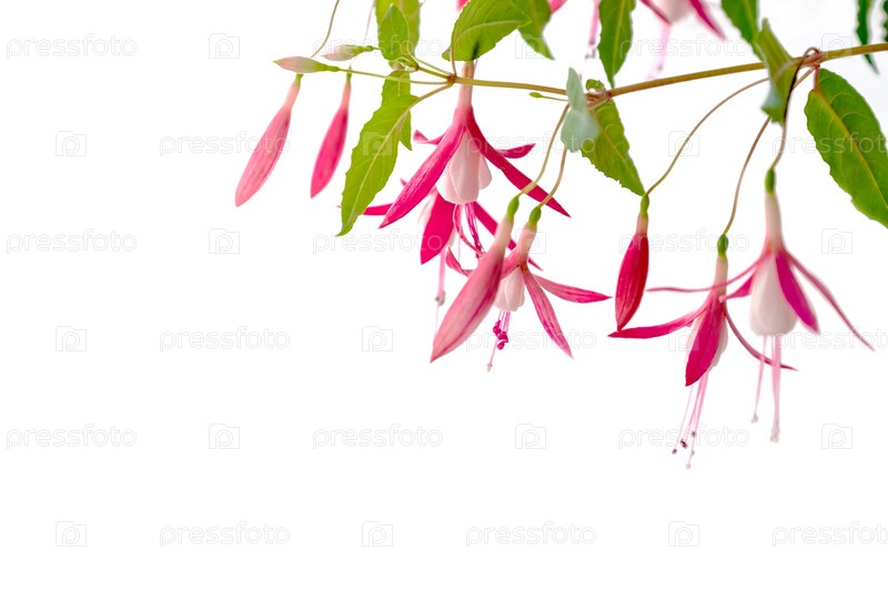 Белые и розовые цветы цветущего комнатного растения Фуксия на белом фоне