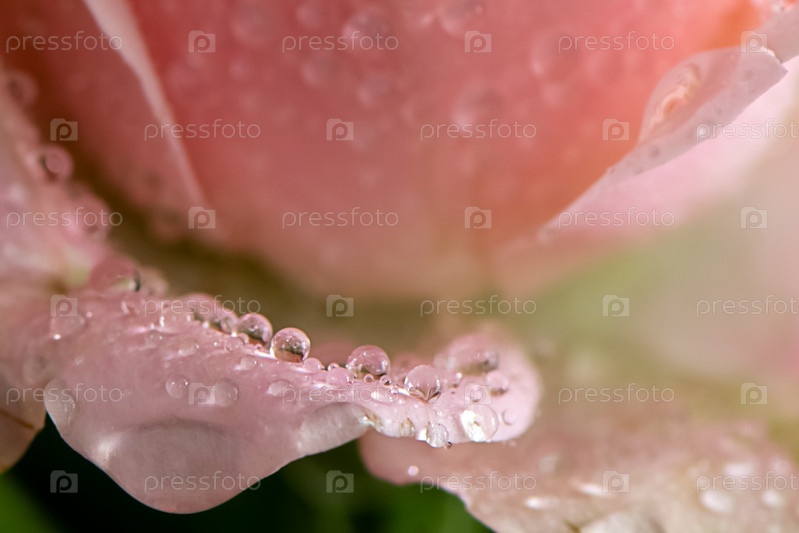 Круглые капли росы на розовом лепестке роз крупным планом цветочный фон