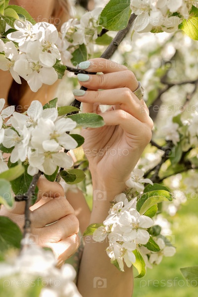 Женщина держит ветку яблони в цветущем весеннем саду