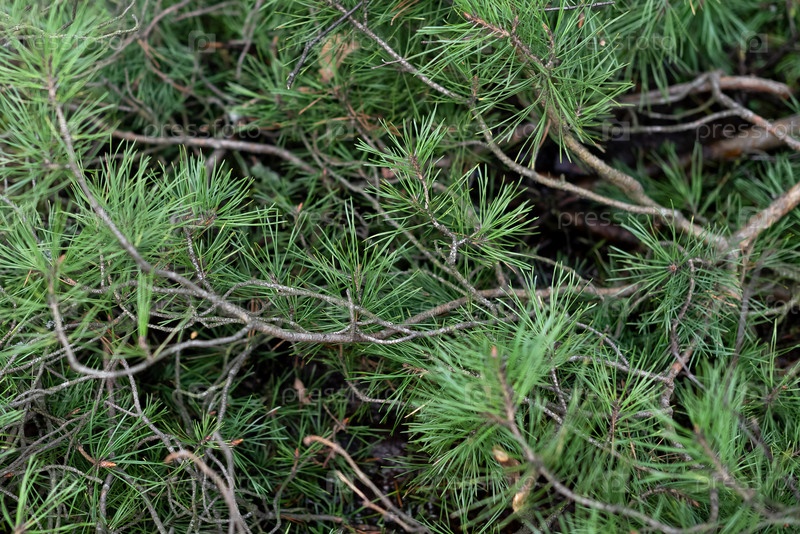 Ветви сосны с длинными зелеными иголками на естественном фоне