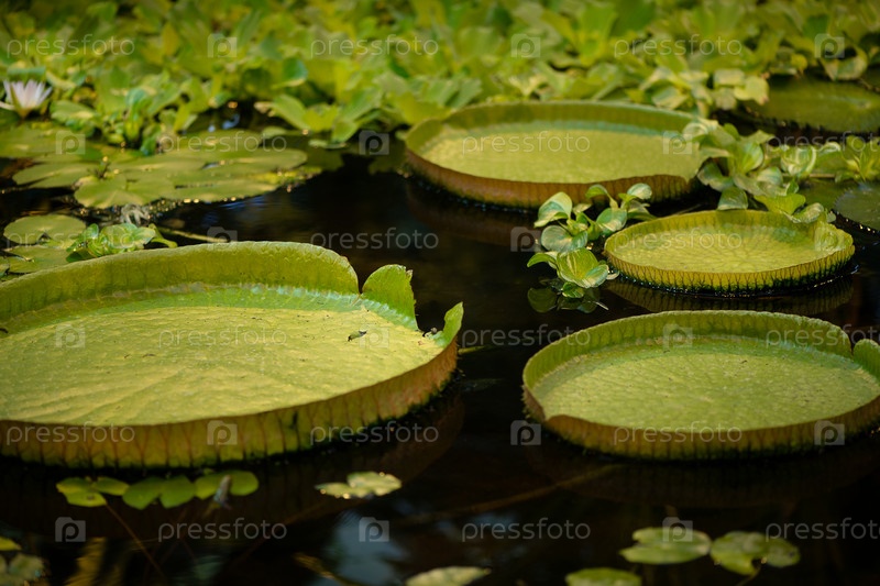 Огромные листья водяной лилии Виктории амазонки, плавающие в воде пруда крупным планом