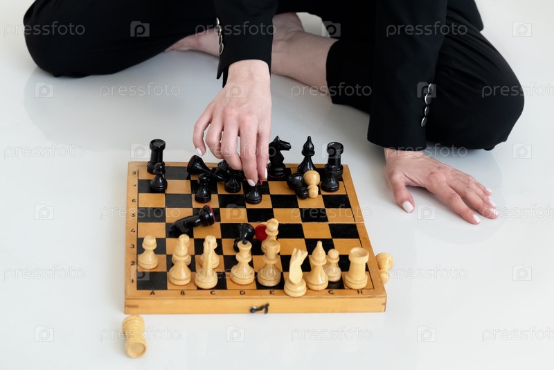 Женская рука двигает шахматную фигуру на старой деревянной шахматной доске