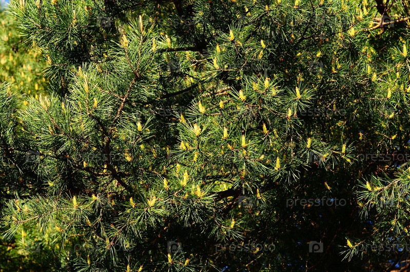 Зеленый фон из веток сосны с новыми ростками и шишками