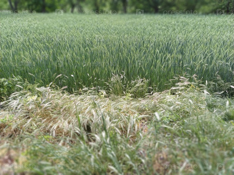 Стенный ячмень или Hordeum murinum растет рядом с пшеничным полем. Сельскохозяйственные злаки. Травы и полезные растения. Мягкий фокус