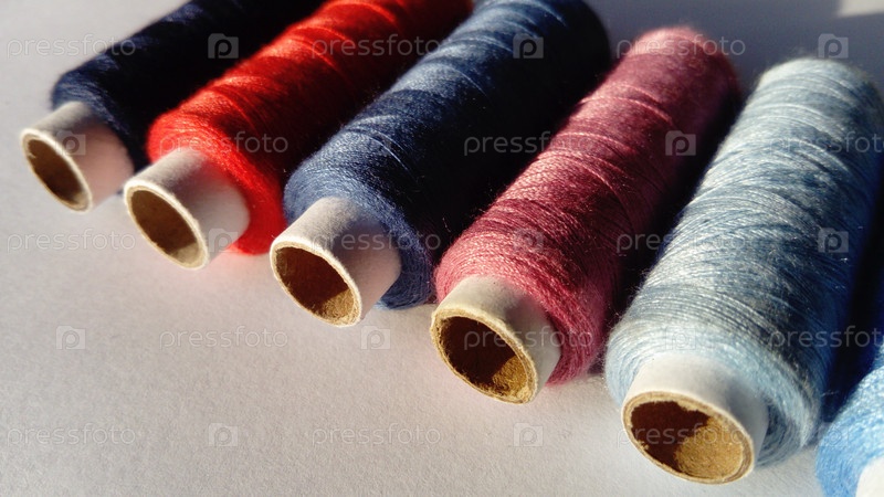 Бабины и катушки ниток разных цветов. Белый фон. Синий, красный, розовый, серый, черный. Крупным планом