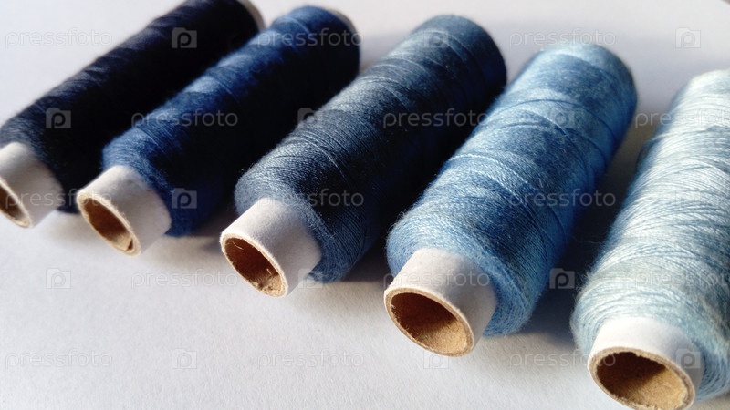Крупный план нескольких бобин с нитками разных оттенков синего. Катушки с нитками на белом фоне