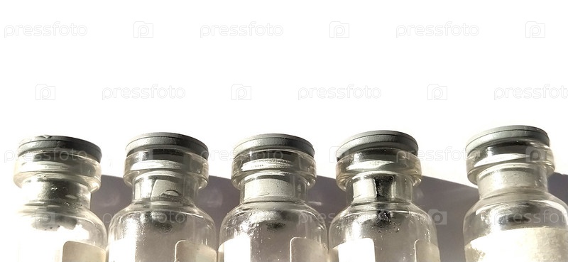 Небольшие прозрачные флаконы с серыми резиновыми крышками. Пять закрытых стаканов стоят подряд на белом фоне. Изолировать Медицинские препараты для повышения иммунитета и лечения вирусных и бактериальных заболеваний человека