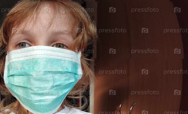 Лицо красивой белой шестилетней девочки в зеленой защитной хирургической маске. Лицо с глазами с серой радужкой. Светлые волосы. Защита от бактерий и вирусов