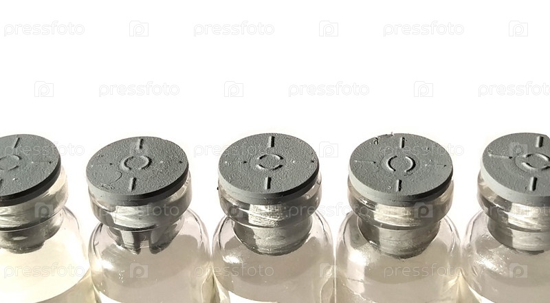Небольшие прозрачные флаконы с серыми резиновыми крышками. Пять закрытых стаканов стоят подряд на белом фоне. Изолировать Медицинские препараты для повышения иммунитета и лечения вирусных и бактериальных заболеваний человека