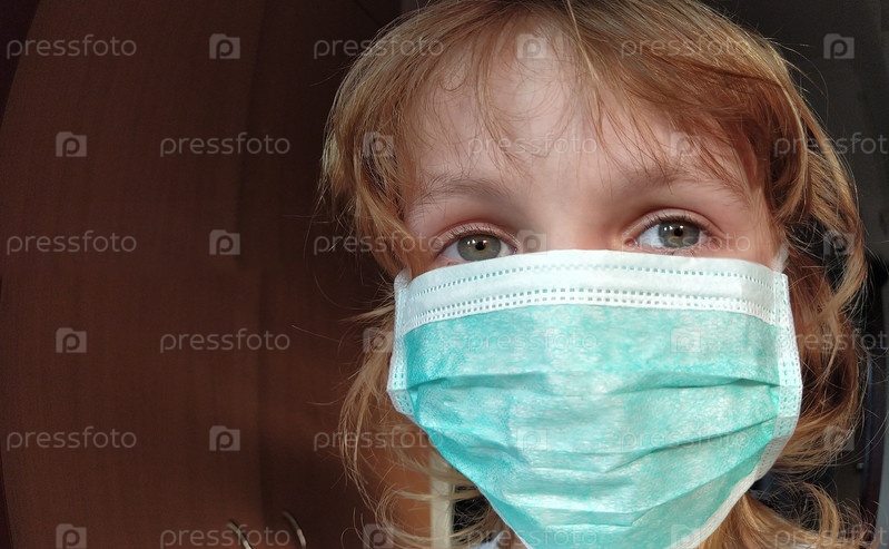 Лицо красивой белой шестилетней девочки в зеленой защитной хирургической маске. Лицо с глазами с серой радужкой. Светлые волосы. Защита от вирусов