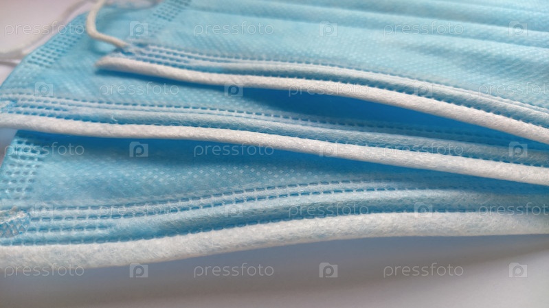 Синяя защитная маска для лица. Средство от коронавируса и инфекционных возбудителей. Синтетический материал. Крупный план. Дневной мягкий свет. Белый нежный фон