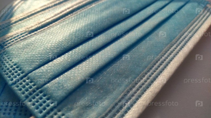 Защитная хирургическая маска синего цвета с белой каймой по краям. Средство от коронавируса и инфекционных возбудителей. Синтетический материал. Крупный план. Естественное солнечное вечернее освещение. Серый фон