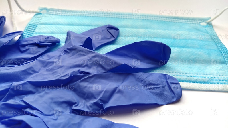 COVID-19. коронавирус. медицинские латексные перчатки и защитная голубая хирургическая маска на белом фоне. защита от биологической опасности Большой план. тестовый комплект. изображение или фон с медицинской тематикой. синяя тонкая перчатка