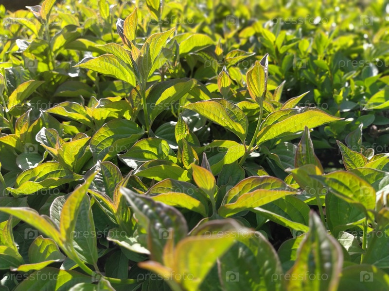 Чайная плантация крупным планом. Косое вечернее солнце. Снято против света