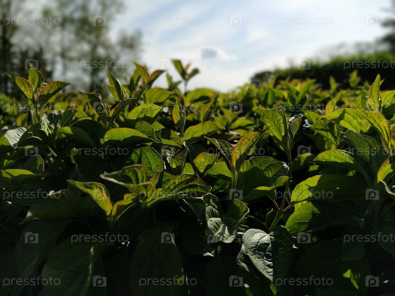 Зеленые растения крупным планом с подсветкой. Озеленение в городском парке. Частично расфокусирован