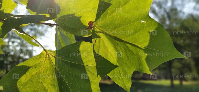 Кленовые листья. Листва с подсветкой на дереве. Размытый фон. Изображение с избирательным фокусом. Кленовый лист крупным планом с подсветкой