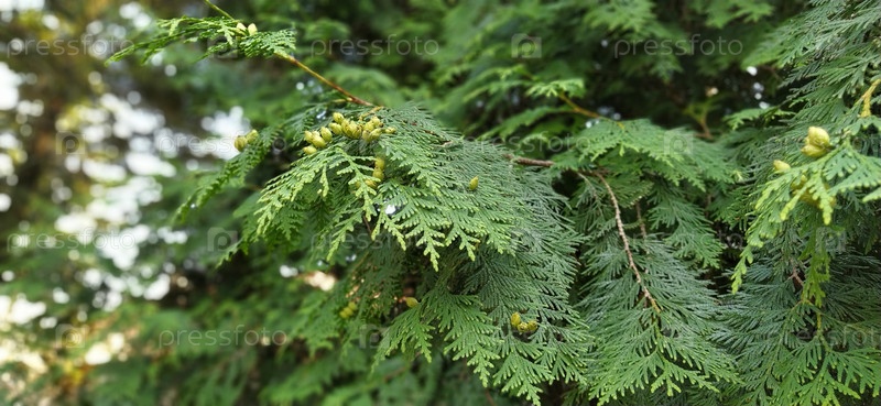 Ветка кипарисового кедра. Туя западная — вечнозеленое хвойное дерево из семейства Кипарисовых. Макрос ветки кипариса с шишками