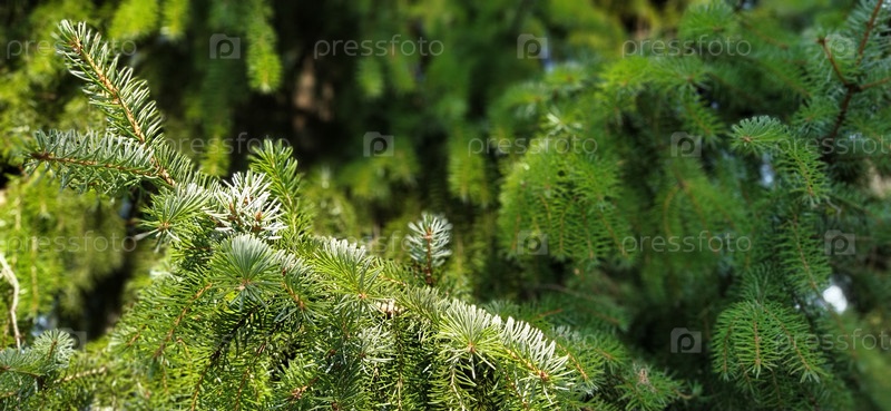 Красивые блестящие еловые ветки. Естественный фон. Тонкая хвойная хвоя. Фон из веток елки. Частично расфокусирован