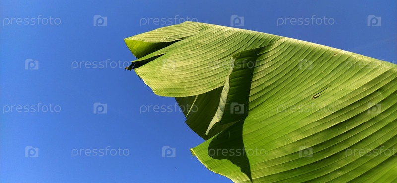 Банановые ветви и листья. Тропическая пальма. Солнечная погода. Текст листьев Tropicana, природа большого пальмового листа и фон неба