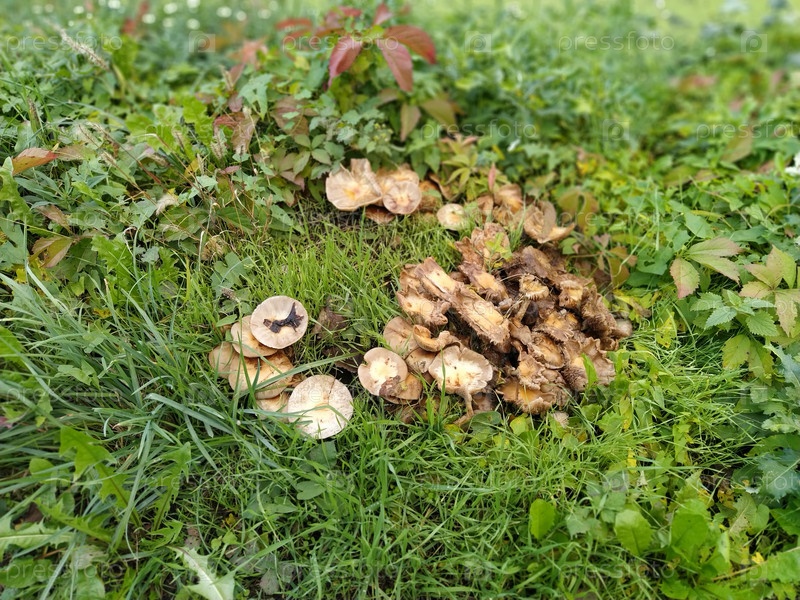Колонии лесных грибов в листве и траве. Смешанный лес