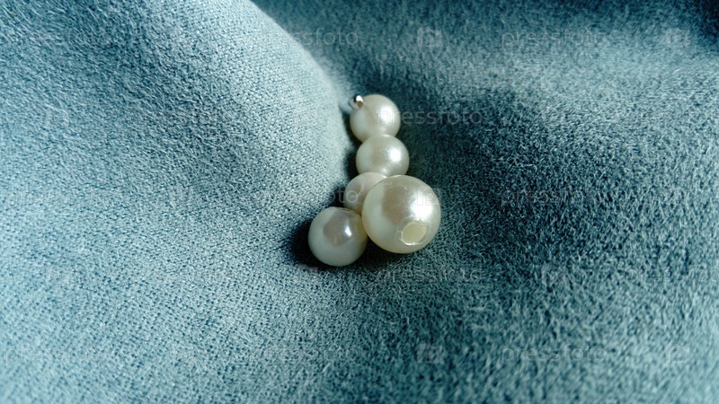 Белые бусины лежат на бархатной синей ткани. Украшения на шторах. Красивое сочетание перламутрового блеска и светлых переливов на коротком ворсе бархата. Складки и волны на ткани
