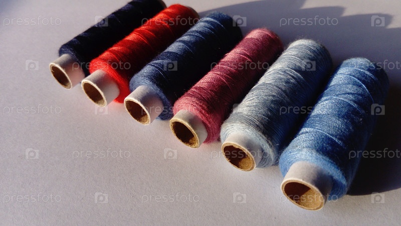 Бабуины и катушки ниток разных цветов. Белый фон. Синий, красный, розовый, серый, черный. Крупный план