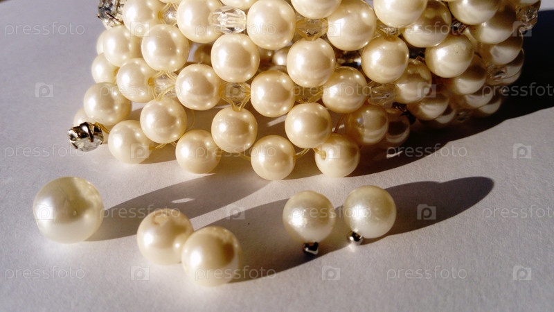Жемчужные украшения на белом фоне. Браслет ручной работы с россыпью бусин. Красивые бусы нежного цвета шампанского. Женственное украшение