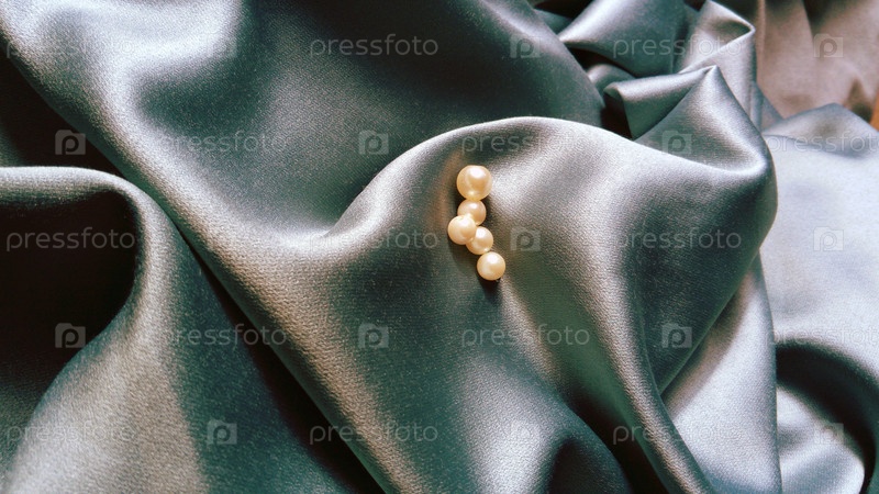 Красивые жемчужные бусы на мятой серой шелковой ткани с зеленоватым отливом. Текстура атласа или натурального шелка. Женские украшения