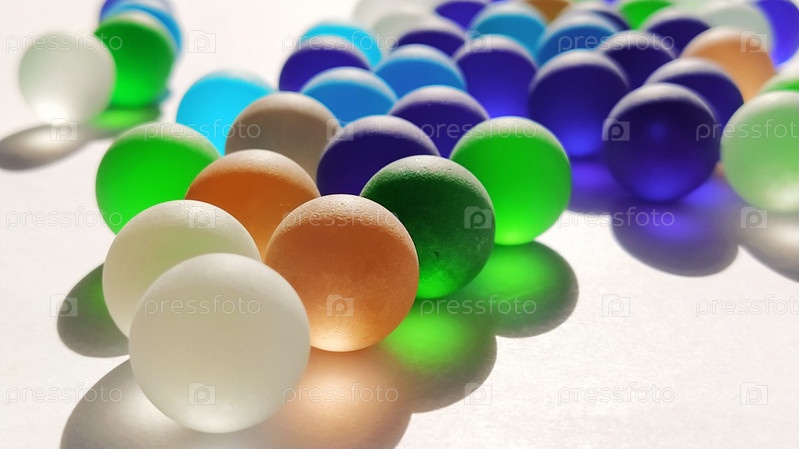 Игровые кликеры или цветные стеклянные шарики, разбросанные по белому фону. заднее освещение